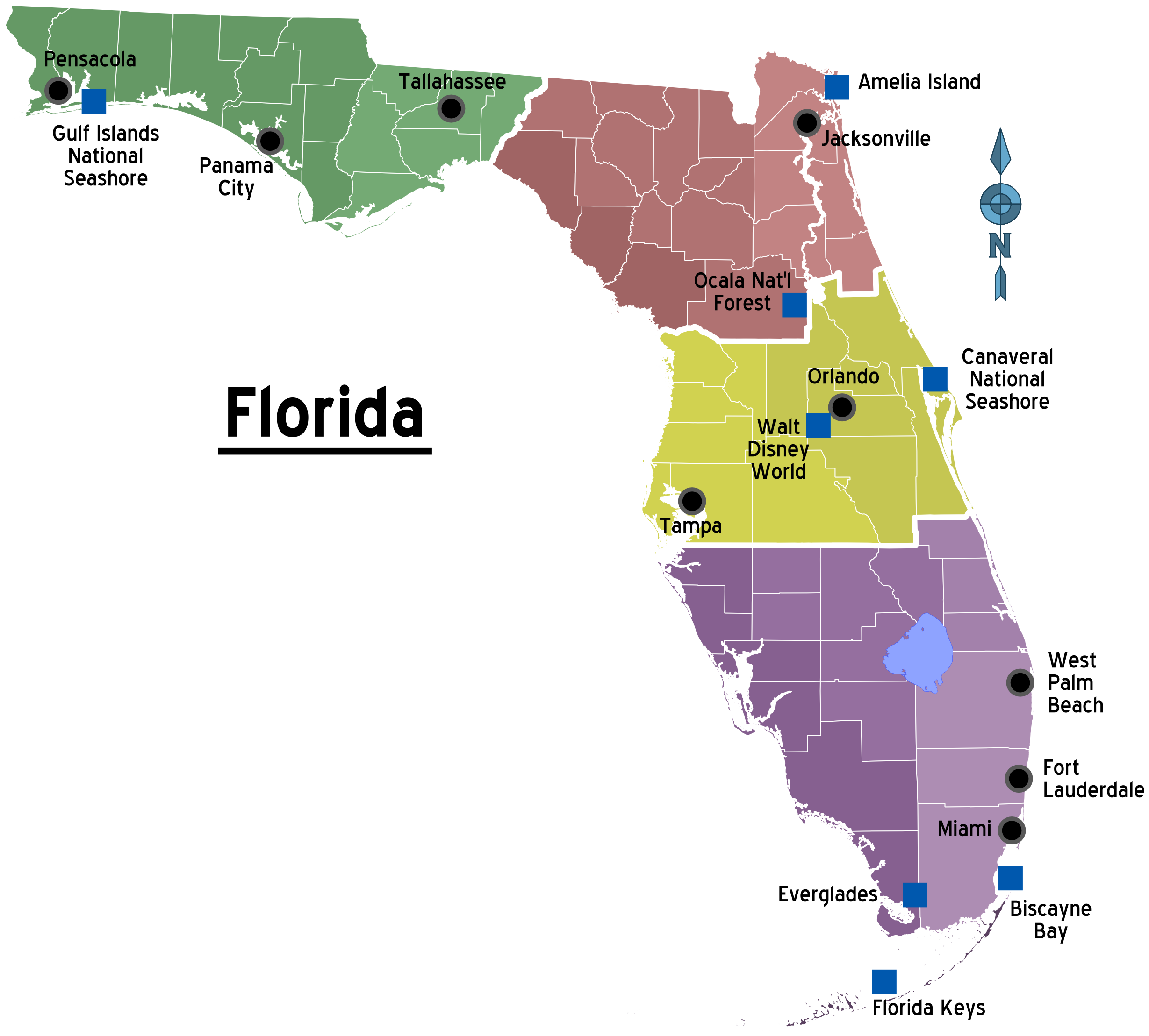 Naples, Sarasota, St. Petersburg, Clearwater, Tampa, Orlando, Gainesville, Tallahassee, Panama City, Pensacola, Jacksonville, St. Augustine, Daytona Beach Kissimmee, Ocala, Melbourne, Vero Beach, Fort Pierce, Port St. Lucie, West Palm Beach, Boynton Beach, Boca Raton, Fort Lauderdale, Hollywood, Miramar, Homestead, Key West Florida.